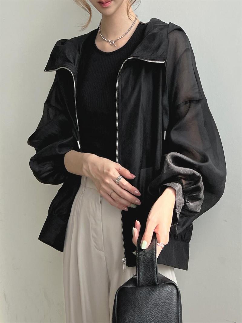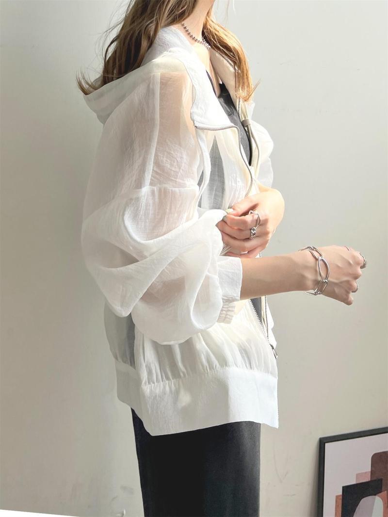 このパーカーは、アウトドアやリゾート、街中など様々なシーンで活躍します。透け感があるので、水着やカットソーなどのインナーを合わせてもおしゃれに見えますよ。また、UVカット機能も備えているため、紫外線から肌を守りながらお出かけできます。