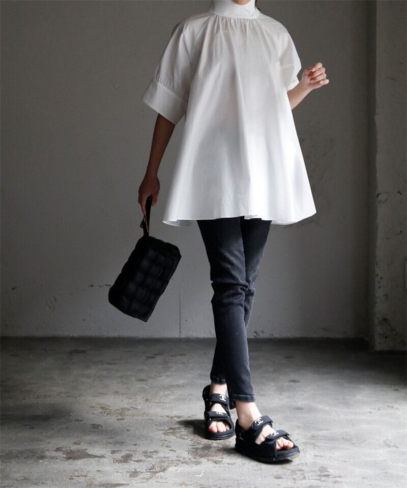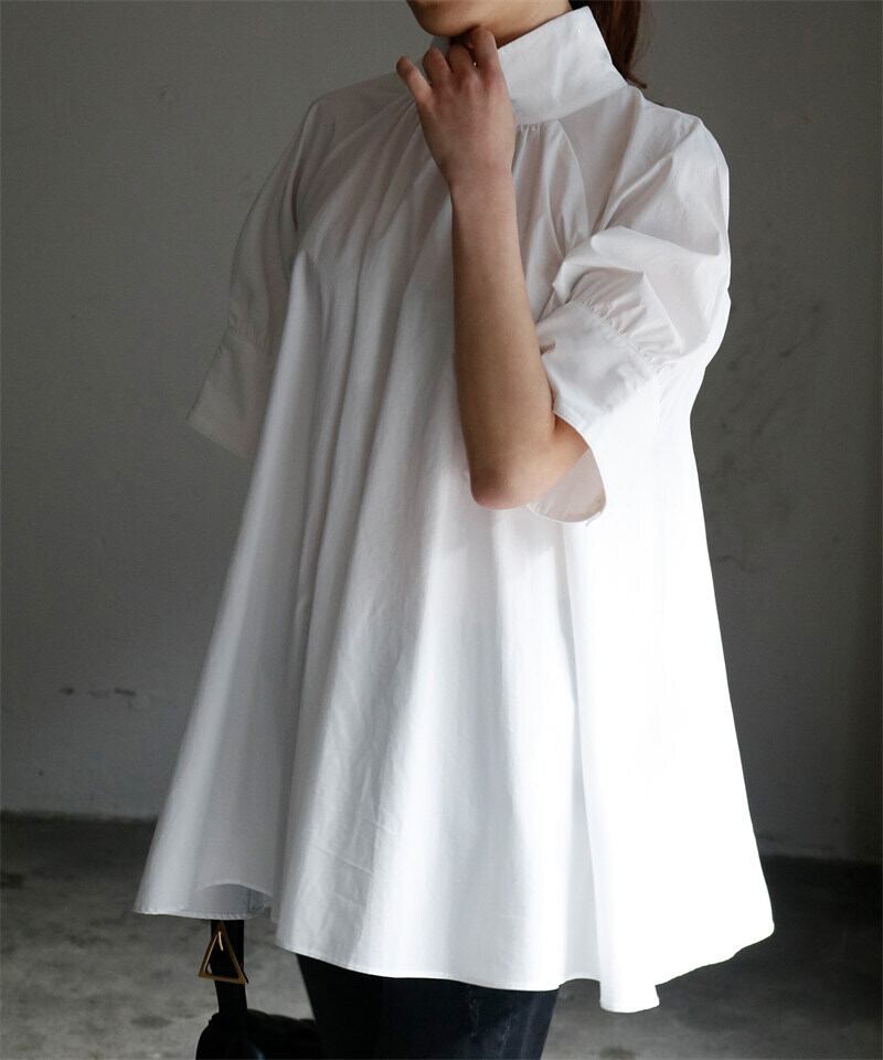 上品さとおしゃれさを兼ね備えたエレガントシャツ。首もとのアクセントデザインがおしゃれなポイントです。トレンドを取り入れたデザインなので、他とは一線を画したおしゃれなスタイルを楽しむことができます。また、お尻まで隠れる長めの丈が体型カバーにも効果的。カッコよく、さりげないエレガントさを演出します。