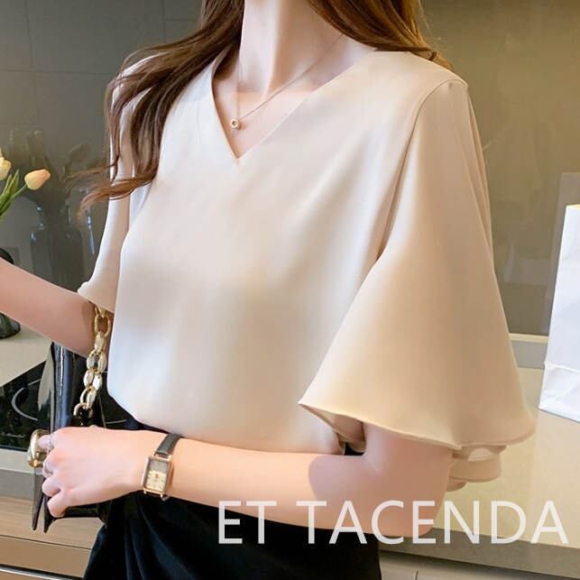 プルオーバー無地 Vネックフリルスリーブ 半袖 シャツ