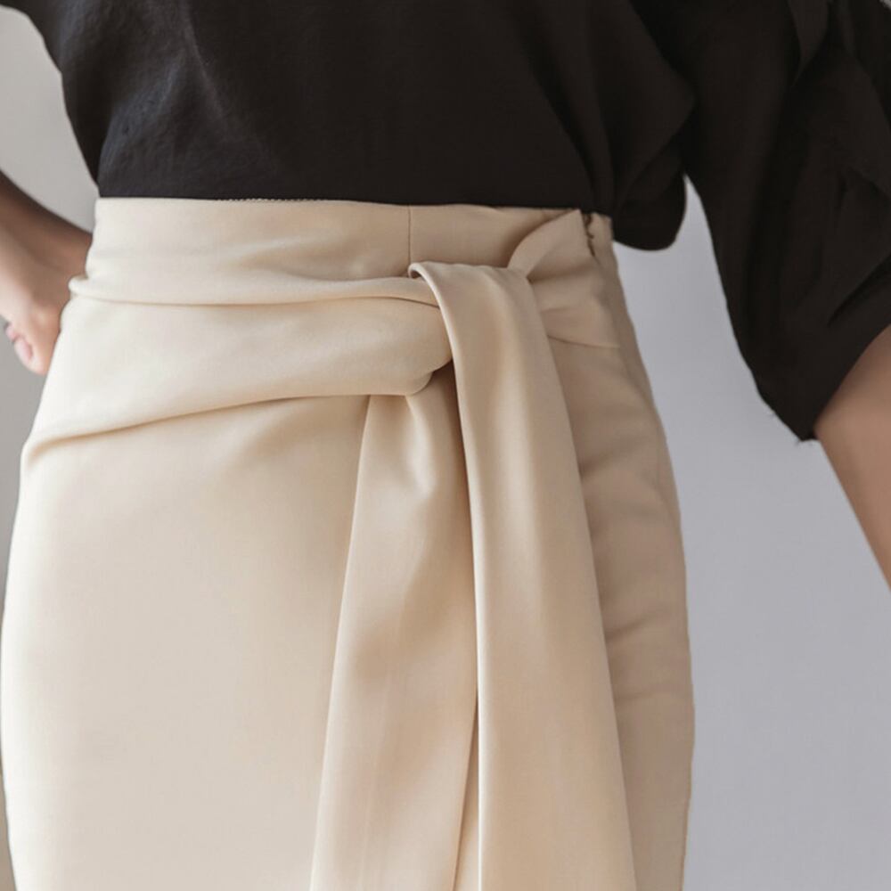 タイトなシルエットとリボンデザインが女性らしさを引き立て、腰回りをスッキリと見せてくれます。