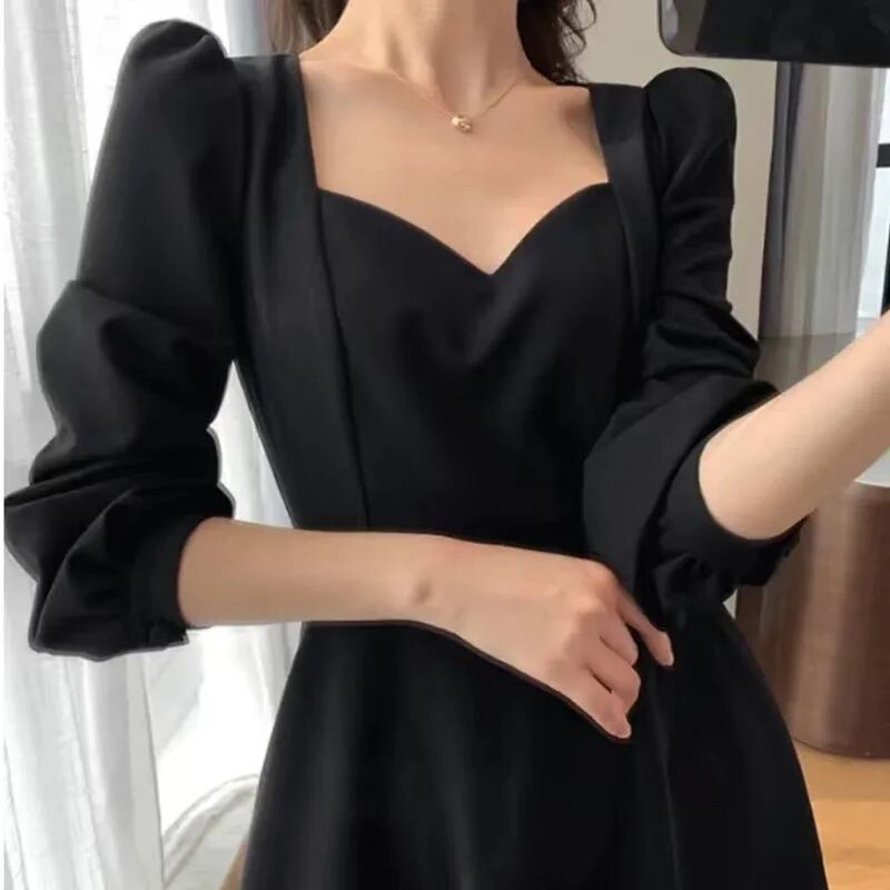 デコルテのラインが綺麗に見えるデザインで、女性らしさを引き立てます。エレガントな雰囲気を演出しながら、可愛らしさも兼ね備えた一着です。ミドル丈なので、どんなシーンでもちょうどいい丈感で着こなせます。
