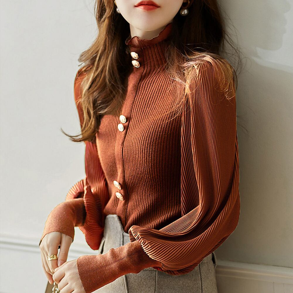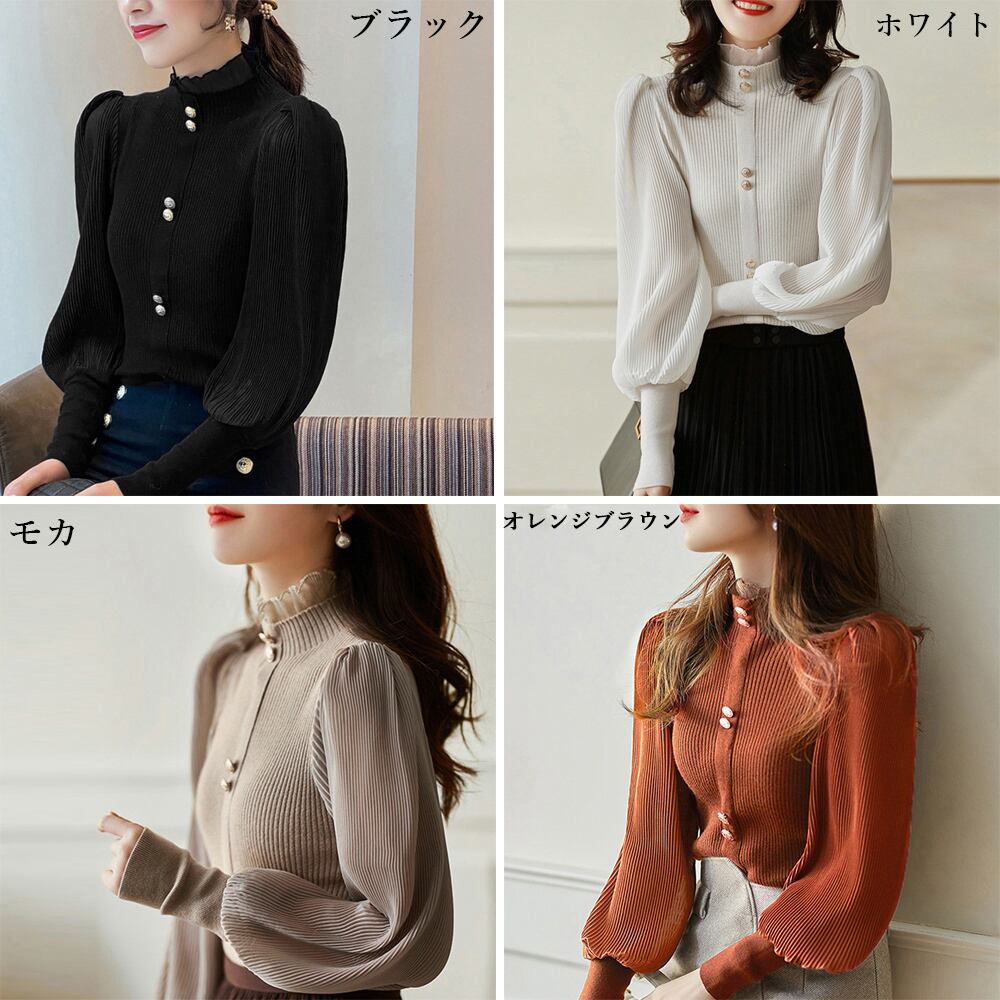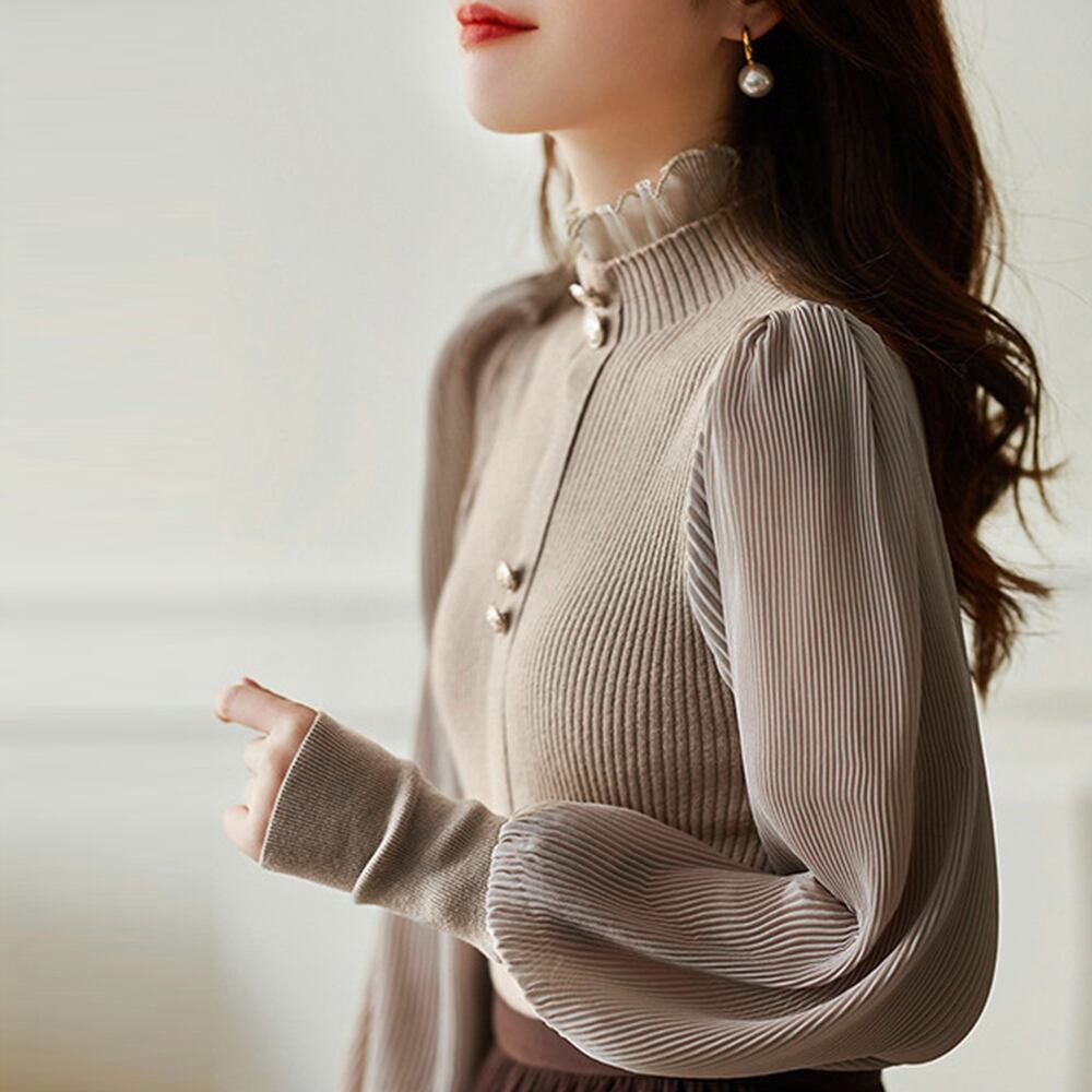 袖切り替えにシフォンプリーツが施された、ユニークなデザインが特徴です。パフスリーブとドッキングされたニットは、女性らしい柔らかな印象を与えます。