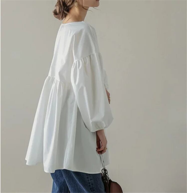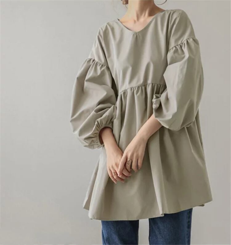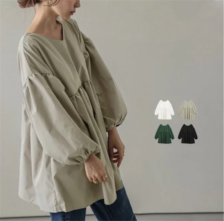 ゆったりとしたシルエットが特徴で、体型カバーも叶います。程よいボリューム感の袖が女性らしさを引き立て、一気におしゃれ度がアップします。カジュアルなデザインなので、デイリーコーディネートにぴったりです。さらに、お尻が隠れる丈感も嬉しいポイント。ご自宅でも外出先でも活躍すること間違いなしです!