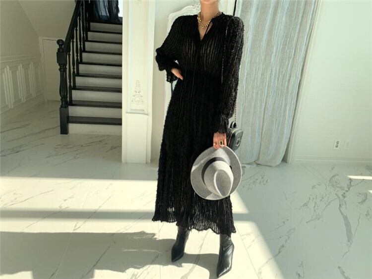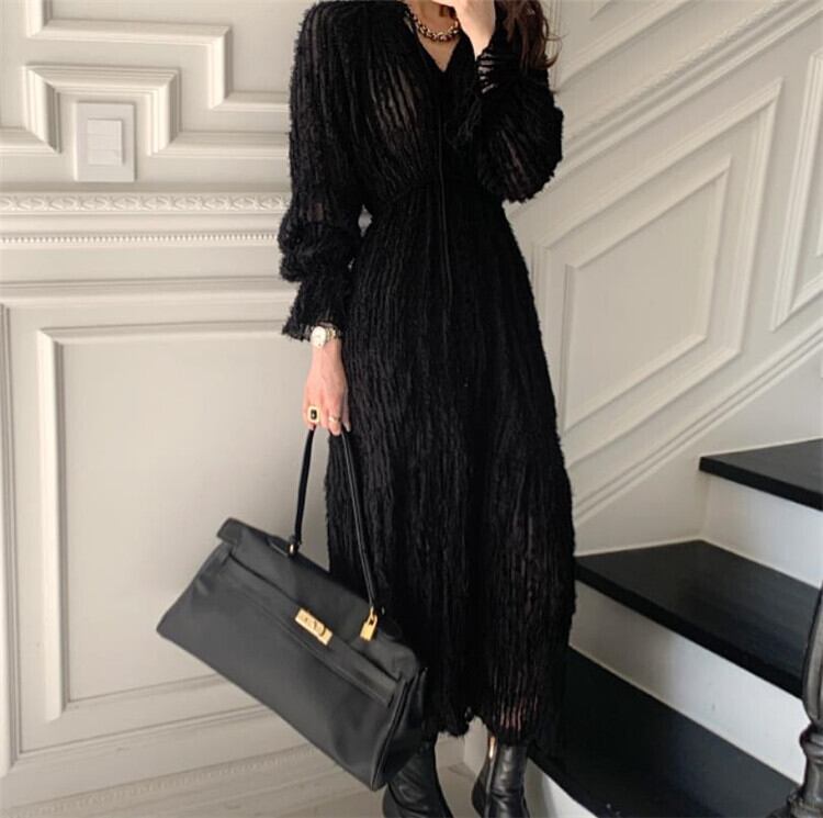エレガントなデザインの伸縮性のあるウエスト ホーンスリーブ Vネック ワンピースです。
