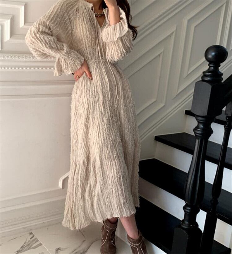 伸縮性のあるウエスト ホーンスリーブ Vネック ワンピース