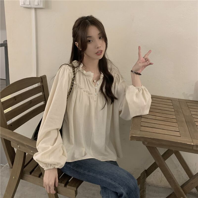 シンプルでありながら、女性らしさを引き立てるパフスリーブルーズフィットブラウス。