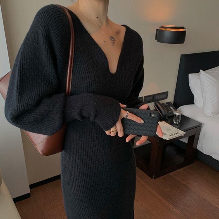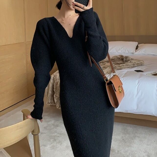 上品な可愛さを演出するvネック柔らかニットスリムワンピース。