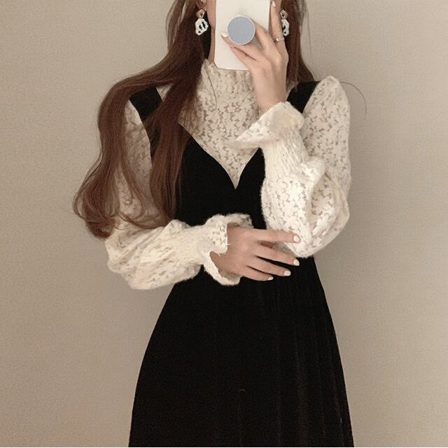 ベルベット地のスカートに華やかなレースのブラウスを合わせた、トレンド感満載のアイテムです。
