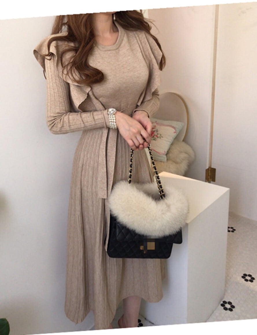 ふんわりとしたニット素材とフリルの切り替えデザインが女性らしさを引き立てます。長袖なので、秋冬の季節にぴったりです。ポリエステルと綿の混合素材なので、柔らかな肌触りと快適な着心地を実現しました。