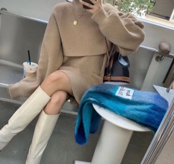 膝上丈とハーフネックの組み合わせは、女性らしさを引き立ててくれます。