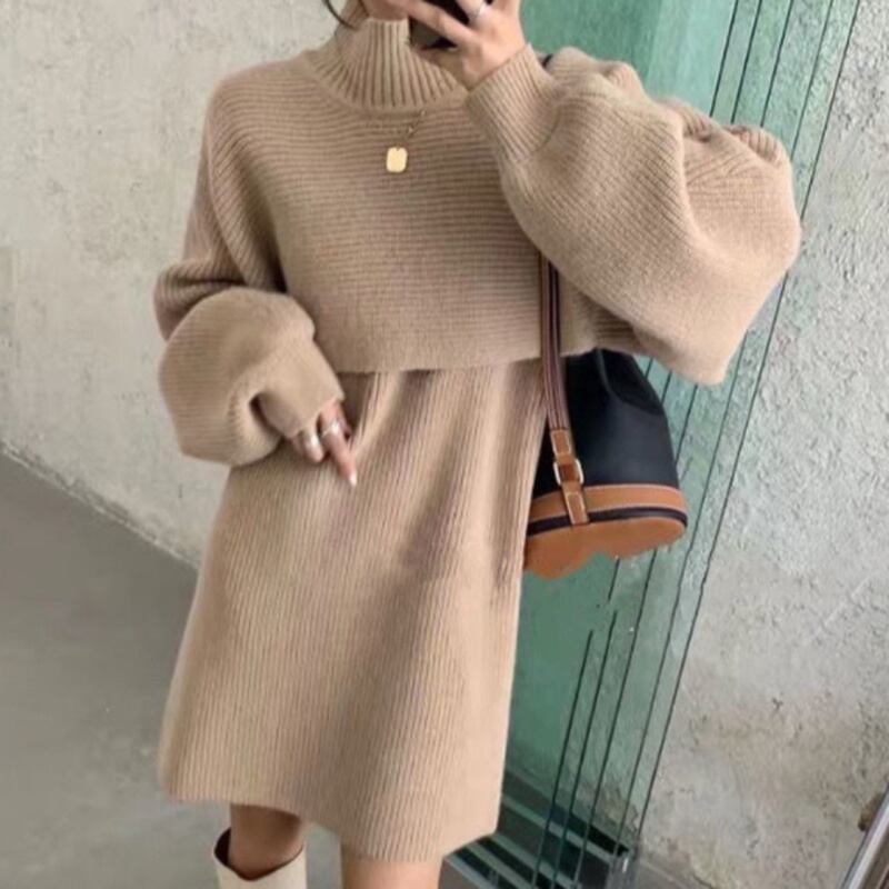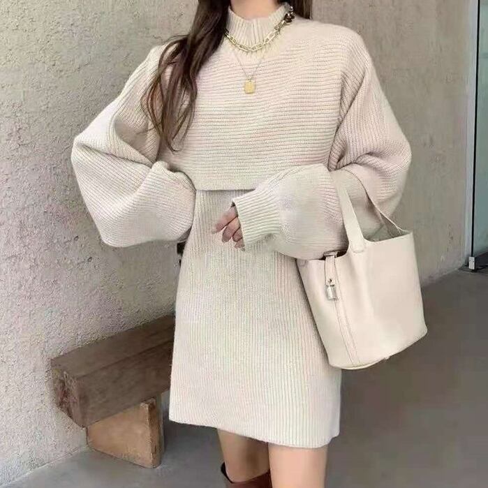 ランタンスリーブ 膝上 ハーフネック 無地 ニットワンピース
