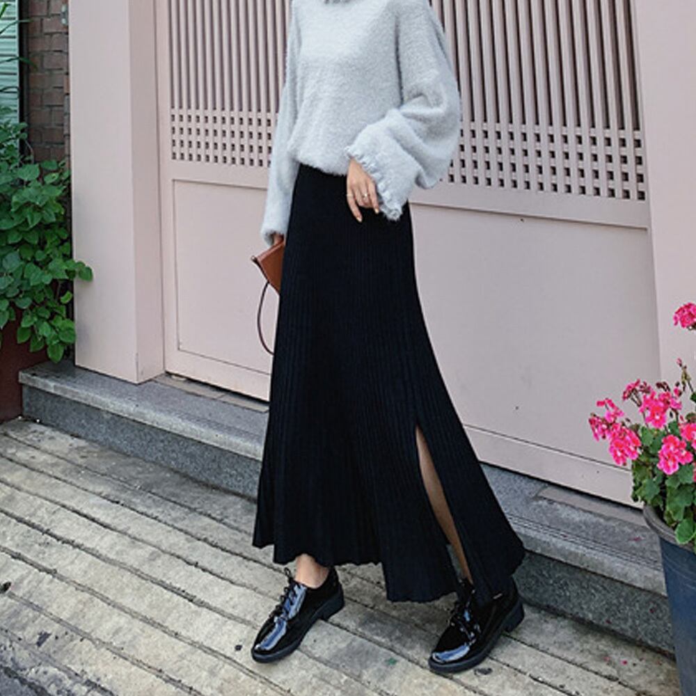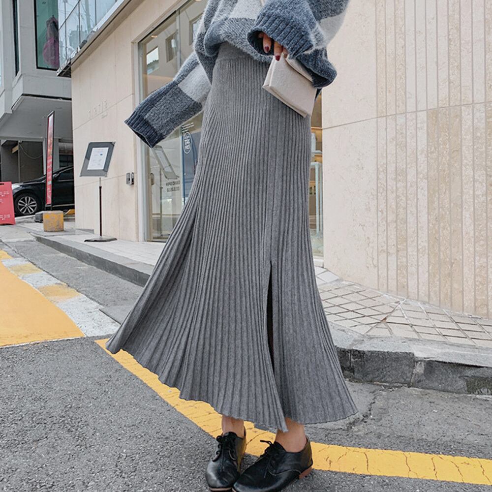 裾に向かって優雅に広がるニットプリーツスカート