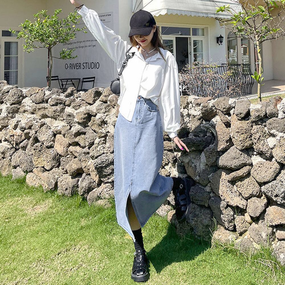 センタースリットで抜け感を演出しつつ足さばきも◎、大人な印象を与えてくれるタイトデニムスカート