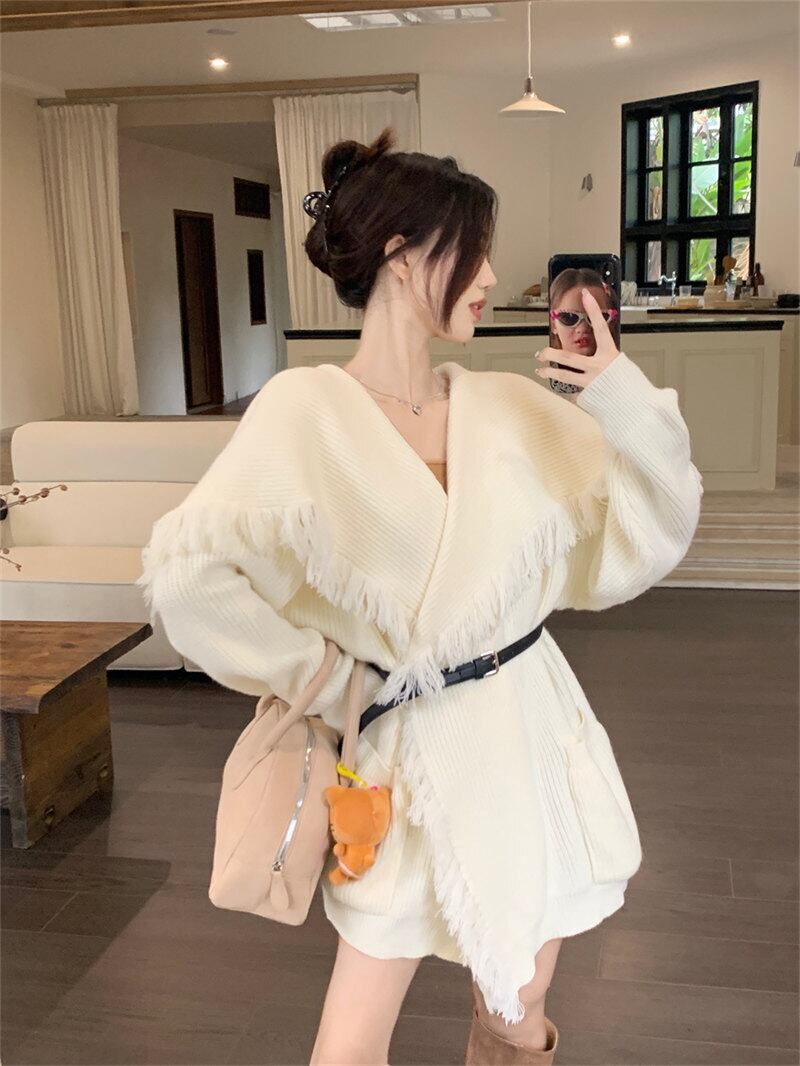 フリジン縁取りで、ポケットもついています。長めの丈なので、コーディネートしやすく、体型カバーもできます。カラーはホワイトとグレーの2色展開です。アクリルとポリエステル混紡素材で、暖かくて肌触りも良いですよ。秋冬のコーディネートに欠かせないアイテムです。さまざまなスタイルに合わせて、おしゃれにアレンジしてみてください。