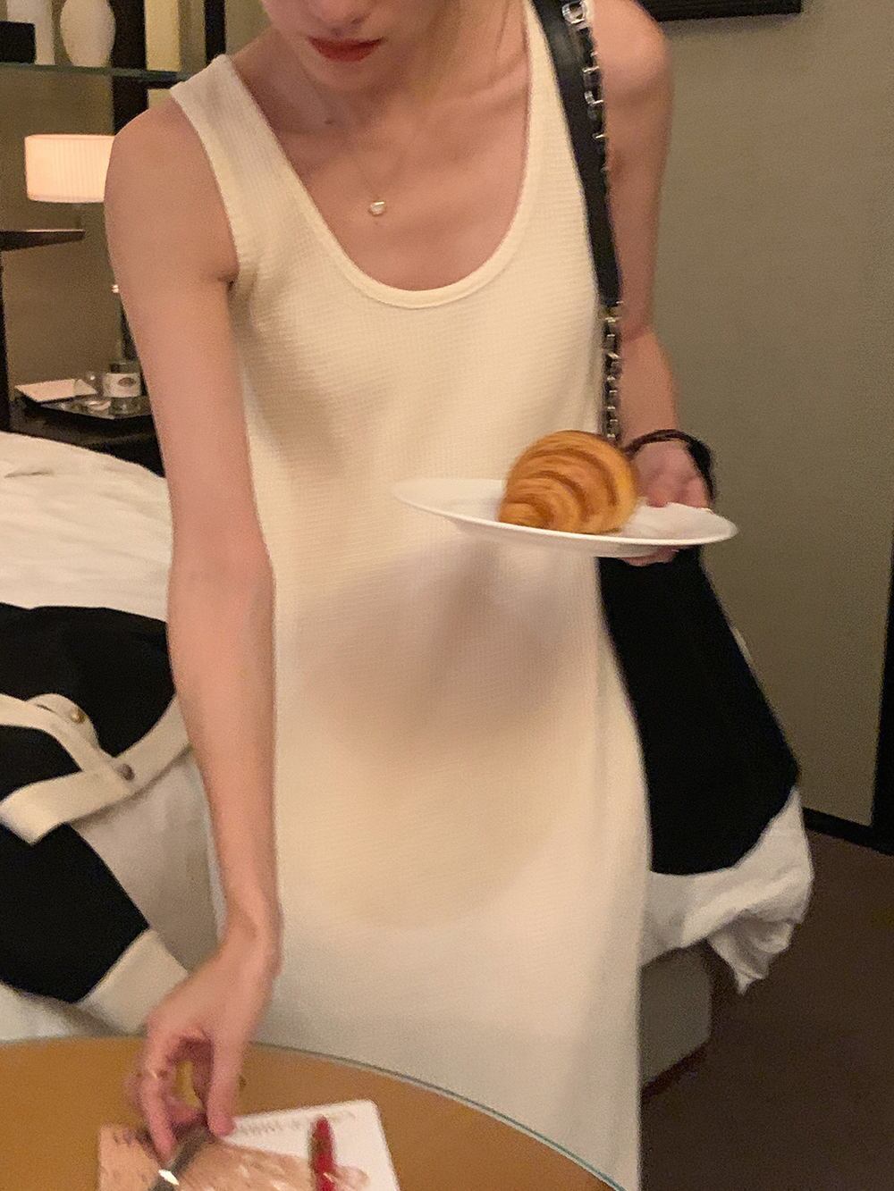シンプルで上品なデザインのベアトップタンクトップニットロングスカート。