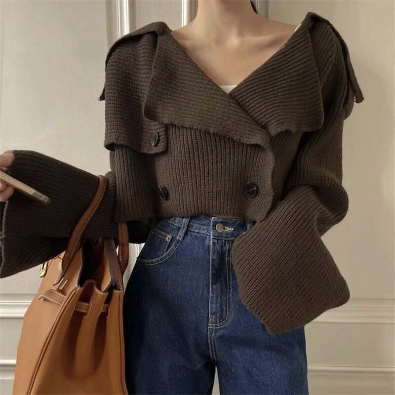 デコルテを美しく演出する折り襟と、個性的なデザインが魅力のダブルブレストセーター✨