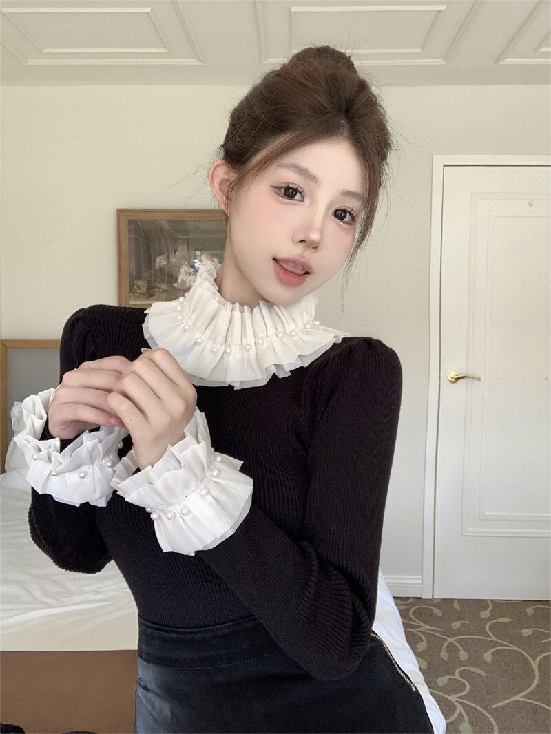 程よい甘さが魅力の大人可愛いニットセーター✨首元と袖口にはフリルとパールの飾りが施され、エレガントなアクセントになっています。