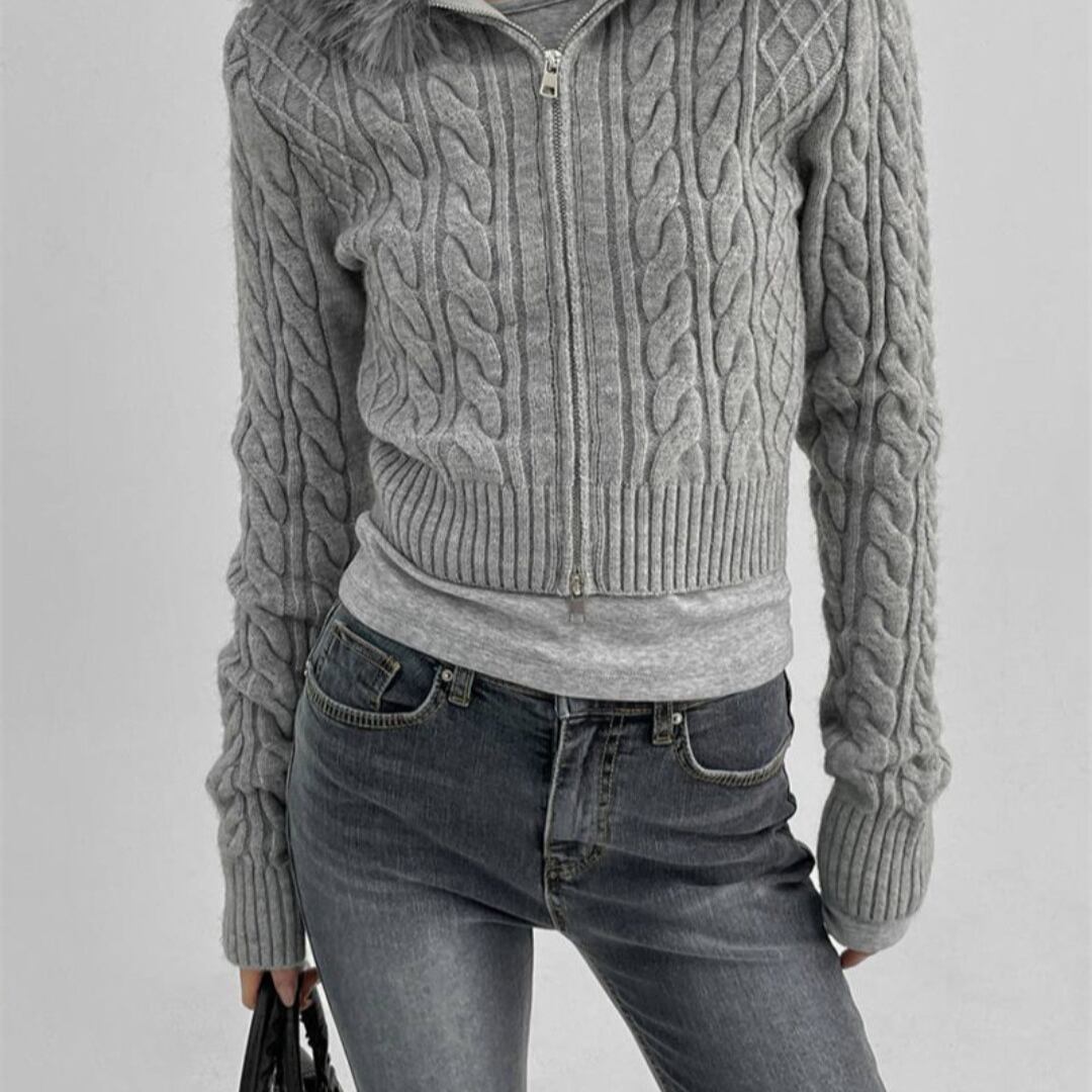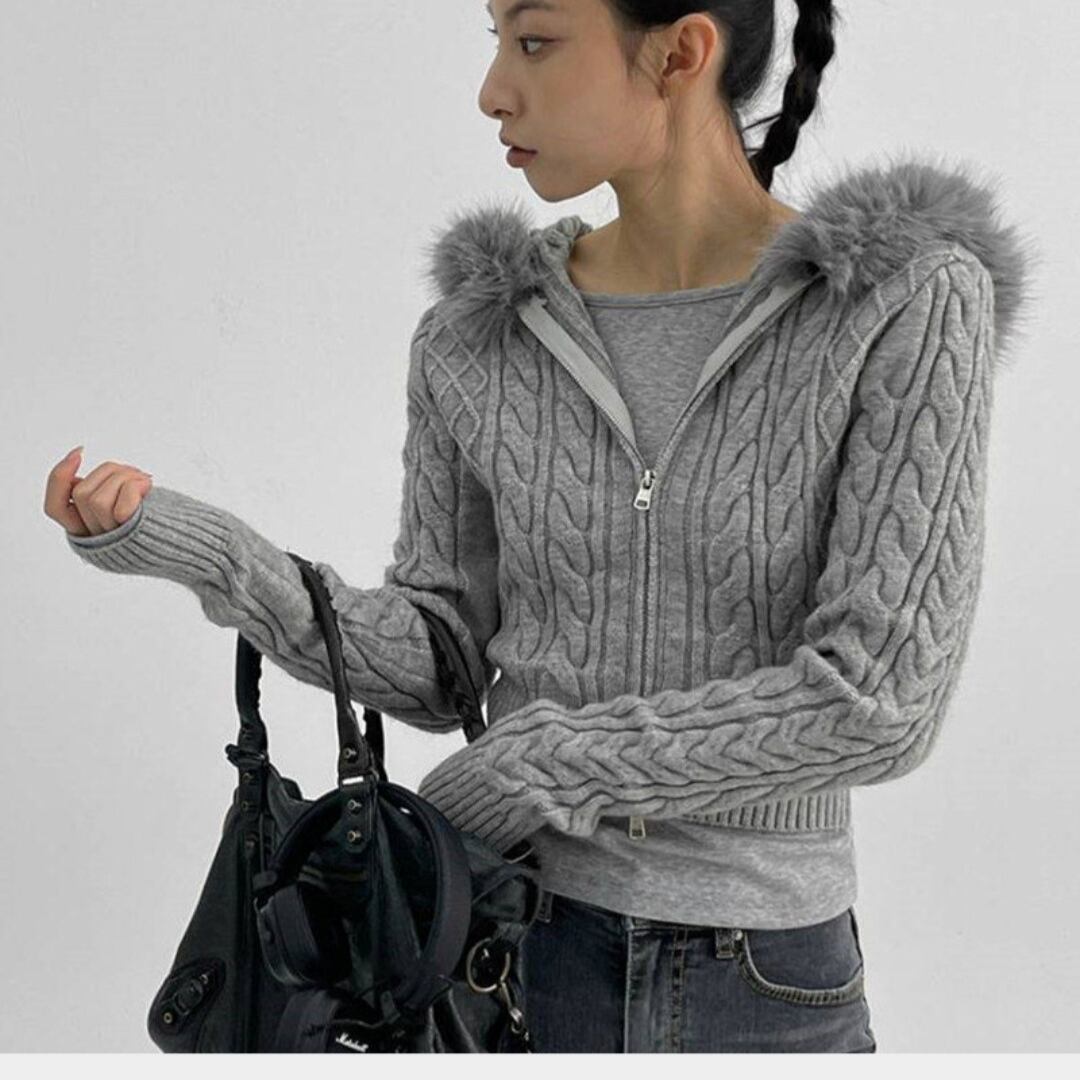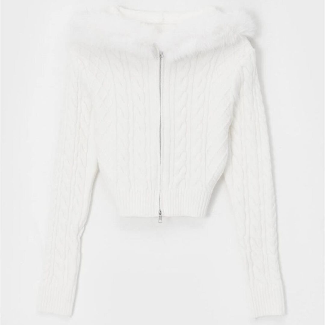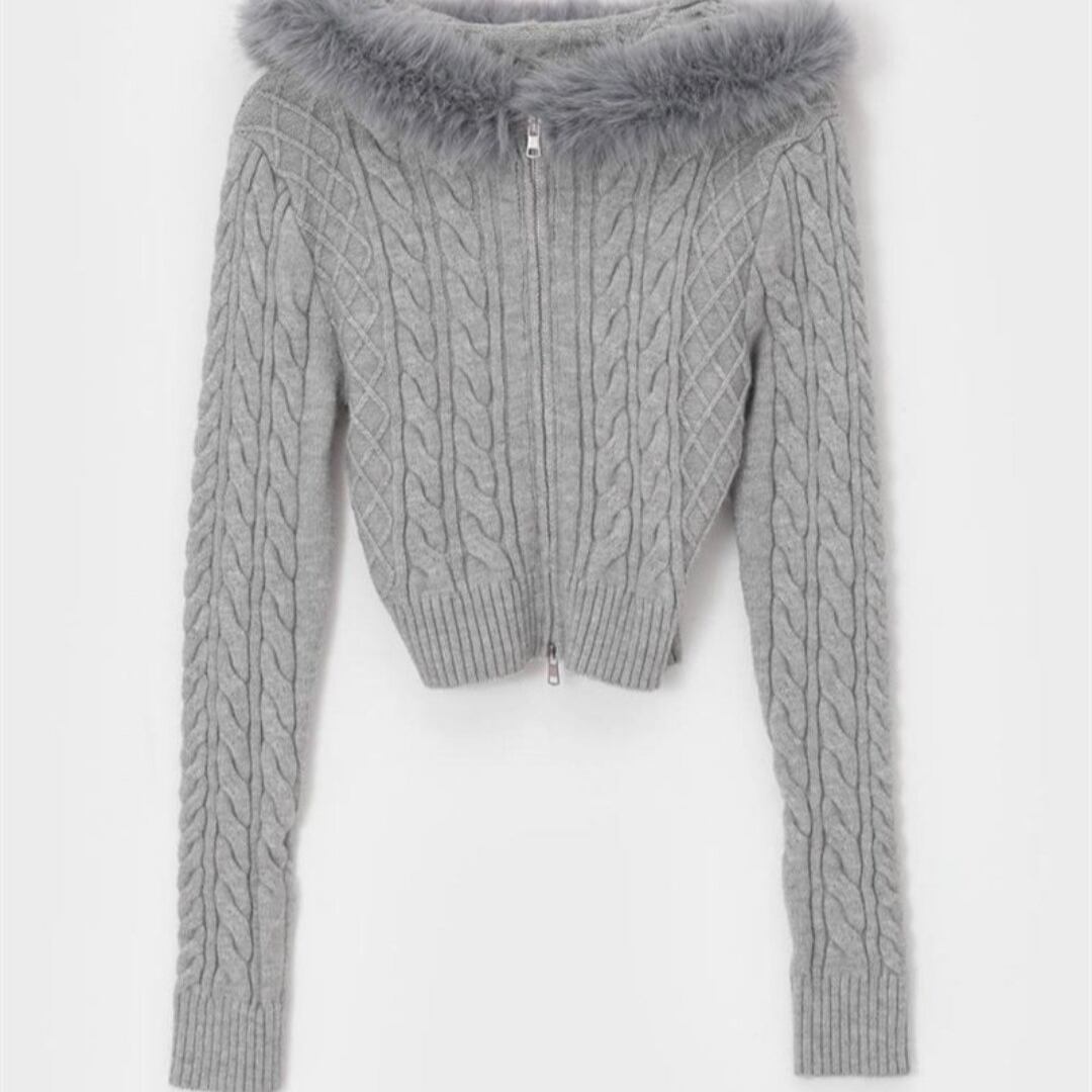 襟ぐりにふわふわファーが施されたこのニットは、上品さと温かみを兼ね備えています。センタージッパー仕様で着脱も簡単!