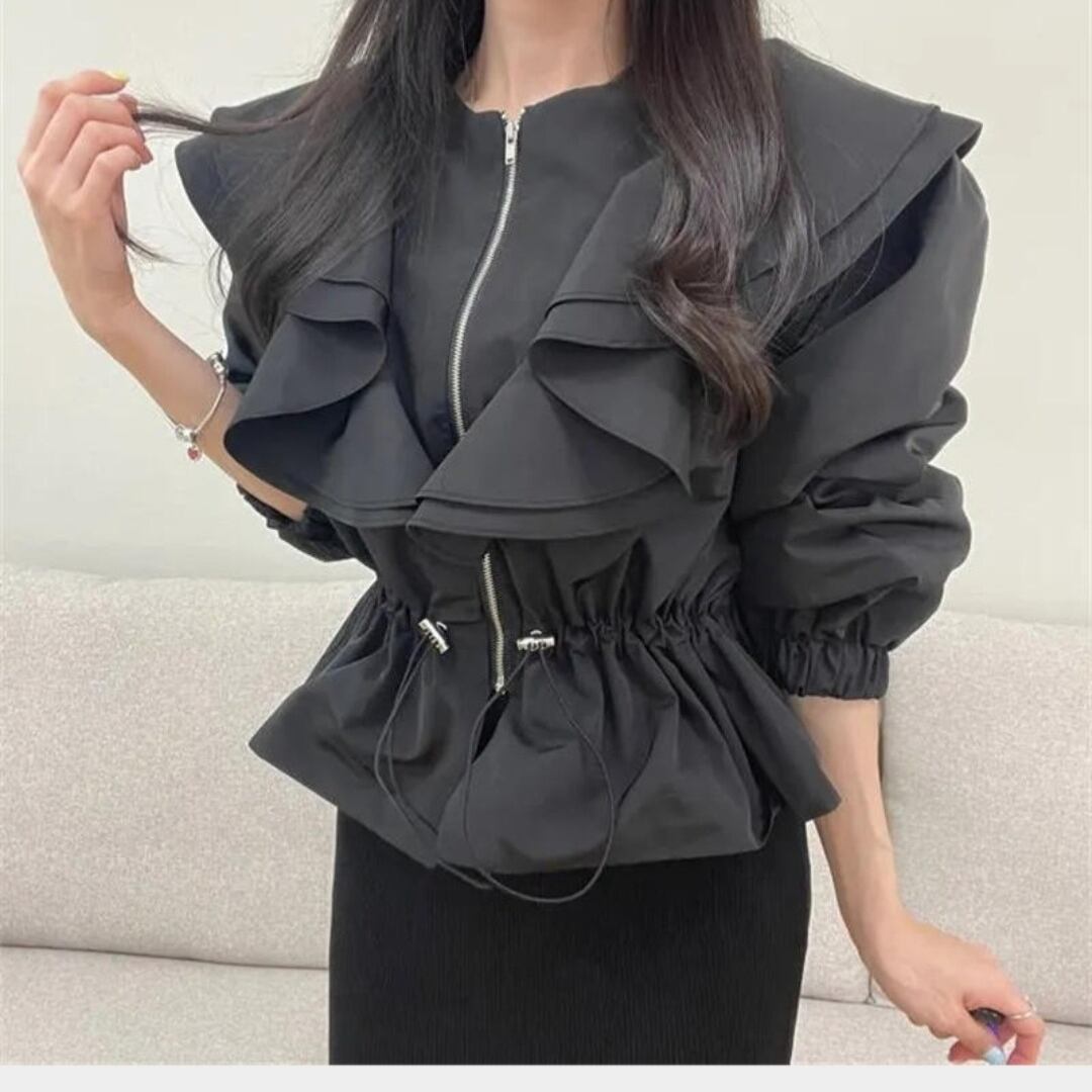 前ジッパー仕様のこのジャケットは、ウエスト調整可能でシルエットも思いのまま!襟ぐりのフリルデザインが女性らしさを強調し、カジュアルから少しおしゃれなシーンまで幅広く活躍します。コットンとポリエステルの素材を使用しており、軽やかな着心地を体感できます。デニムやスカートとの相性も抜群で、これ一枚でおしゃれなコーディネートが完成します。