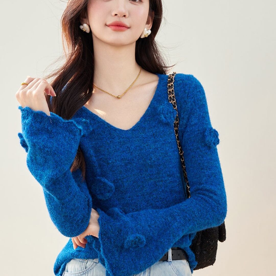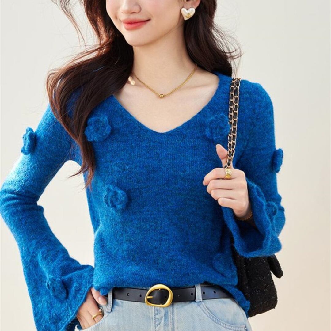 このお花モチーフニットは、可愛らしいお花のデザインと袖口のフレアーが魅力的で、大人の女性にぴったりな一着です。華やかなデザインが首元を美しく演出し、鎖骨が引き立つスタイルに仕上げます。このニットは、普段使いから特別なシーンまで幅広く活躍すること間違いなし。あなたのコーディネートに新たな魅力を加え、日常をもっと楽しむきっかけにしてみてください!